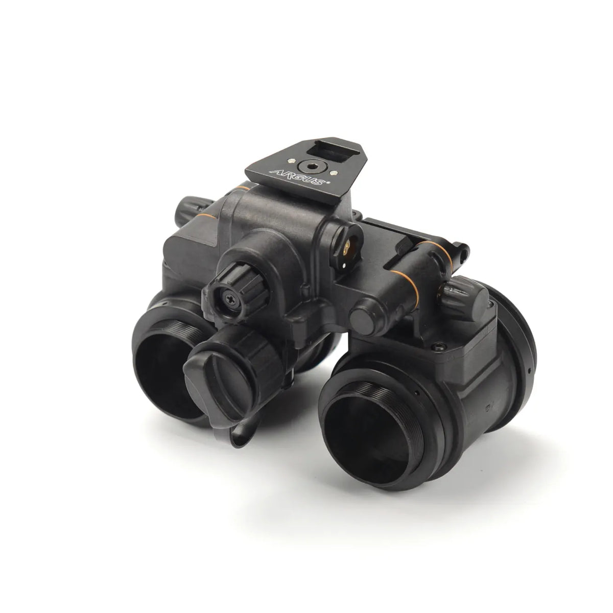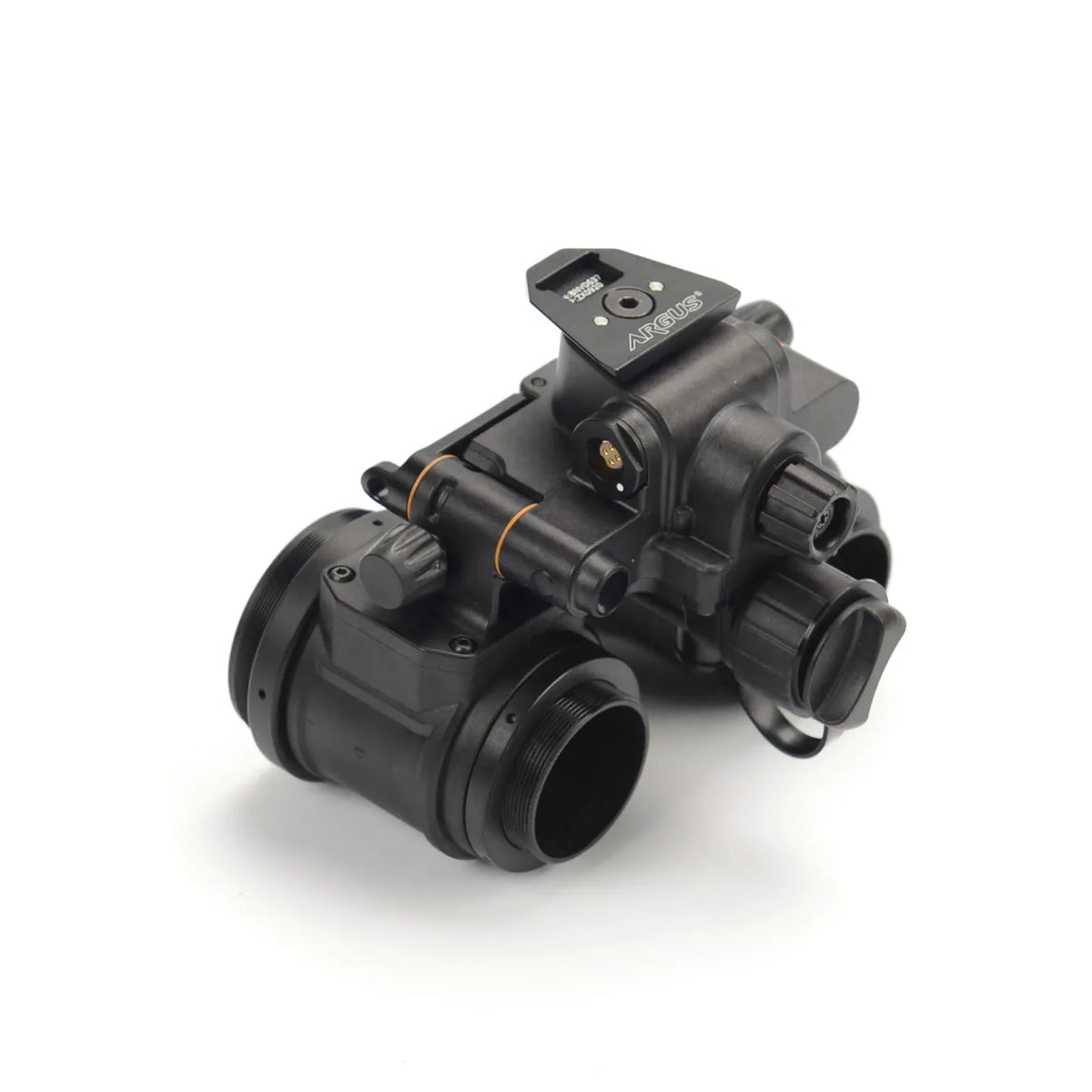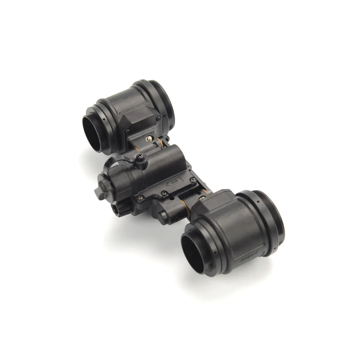 1)Power saving design. When the device stays still for a long time, it will go dormant and power off the tubes until it senses movement again and automatically power on. Indicator light in the pods can remind the user when the power in low; 2)Built-in gravity sensor. It can automatically shut down when flipped up with any helmet mount or head mount. This function does not rely on any magnetic switch or special modifications; 3)Programmable one-hand interface: All electronic functions are programmed and controlled by the chip in the center of the housing bridge. One button controls all functions and can therefore be easily operated with one hand. Automatic flip up shutdown and dormancy functions can be deactivated by pressing the button 5 times. User can turn off the gravity sensor during military free fall, diving or rappelling to prevent unwanted power cut caused by rolling postures.; 4)A red light in the pod can indicate whether the device is in low power or whether certain functions are deactivated; 5)Housing is made of special fiber-enhanced polymer with high strength, high modulus and fire resistant properties to ensure its robustness and durability. The dovetail on the device fits all Wilcox dovetail mounts in the market. Pods can be independently flipped up and down, so that user can quickly switch between single and dual eye configuration according to his/her tactical needs and improve efficiency in combats; 6)The pods are perfectly compatible with Clip-on Thermal Imager such as E-COTI and Jerry-C, so that thermal fusion functions can be added.